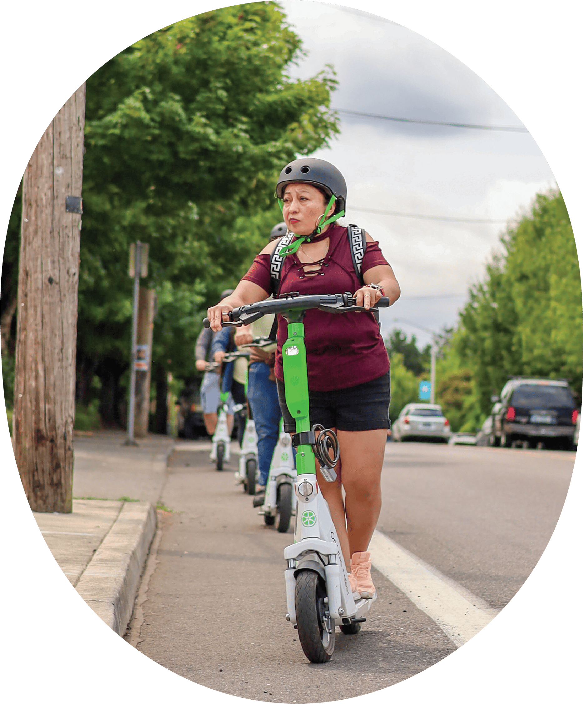 At summer special events, community members access affordable e-scooter services via the suma app and join an organized ride from a convenient community location to a nearby farmers market. At the market, community members access affordable fruits, vegetables and other market products via the suma app, then join an organized e-scooter ride back to their community location.